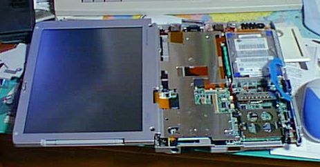 いよいよ本番、PLL の足上げを行う段階になって、猛烈な不安に襲われたため、急遽処置を足上げからパターンカットに変更した。カッターの先を基盤に突き立てて、パターンを切る。とりあえず蓋は開けたままで電源を入れてみる。 表示は Celeron 300MHz。 クロックダウン成功だ。