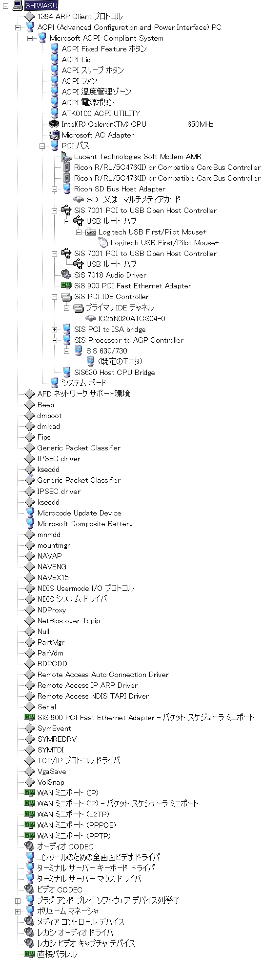 システムのプロパティは次の通り。どれくらいまで、Win98 用ドライバが手に入るだろう。