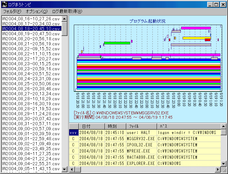 非表示に指定したものも合わせ全ての実行ファイルを 表示します(項目の左にチェックが入ります). もう1度この項目を選ぶと非表示の実行ファイルを表 示しない(通常の)グラフになります. F4 キーを押しても同じことができます. |