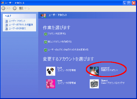 「スタート」メニューの「コントロールパネル」をクリックして開いた窓から「ユーザアカウント」を実行する。