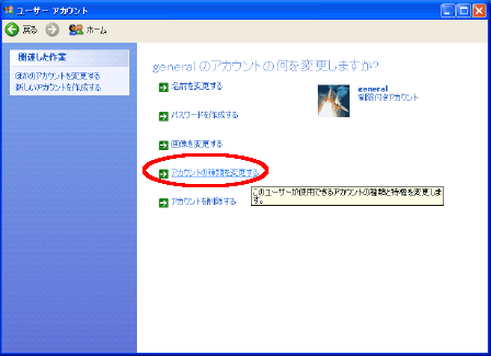 「アカウントの何を変更しますか?」では、「アカウントの種類を変更する」をクリックして選ぶ。