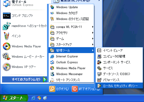 「スタート」→「すべてのプログラム」→「管理ツール」と開き、「ローカルセキュリティポリシー」をクリックする。