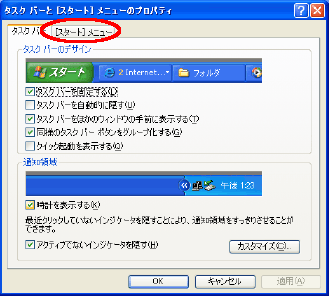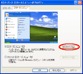 画面中央下方にある「[スタート]メニュー(S)」の右側にある「カスタマイズ」をクリックする。クラッシックスタイルなら、1つ下の「カスタマイズ」をクリックする。