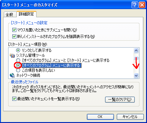 「[スタート]メニュー項目」のリストボックスを、スクロールボタンで下にスクロールさせ、「システム管理ツール」なる項目の「[すべてのプログラム]メニューに表示する」のラジオボタンをクリックする。その上の「[すべてのプログラム]メニューと[スタート]メニューに表示する」を選んでもよい。