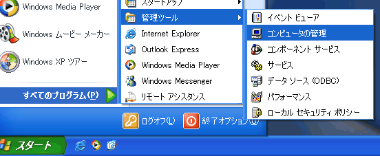 「スタート」→「すべてのプログラム」→「管理ツール」と開き、「コンピュータの管理」をクリックする。