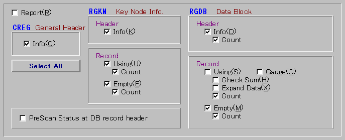 □ Count … 樹構造データレコードの数を出力するならチェックを入れる □ Empty … RGKN にある空きデータレコードの情報を出力するならチェックを入れる □ Count … RGKN にある空きデータレコードの数を出力するならチェックを入れる Header … RGDB のヘッダ部分について