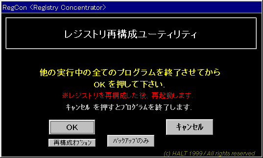 画面の説明にもあるように、RegCon 以外の全てのプログラムで終了できるものは全て終了させてから「OK」をクリックする。理由は2つある。