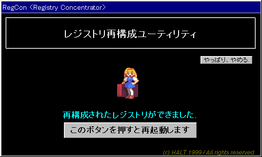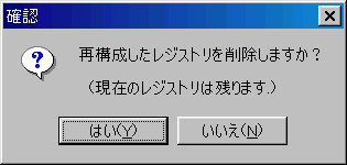ここまで実行したけれど、気が変わって再構成したくなくなった場合は「やっぱり、やめる」をクリックする。再構成には成功しているため、できたばかりの再構成されたレジストリを削除するか尋ねてくるので、希望に応じて答える。ちなみに Windows フォルダと個人のプロファイルフォルダに SYSTEM.CLN、USER.CLN の名で存在している。削除を希望すれば RegCon が再構成後のレジストリだけを全て削除する。