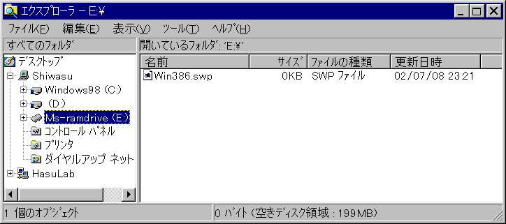 swap ファイルの設定画面では RAM ディスクを選べないので、一旦、D ドライブに swap ファイルを作ることにして再起動し、system.ini を直接修正して RAM ディスクを指定する。