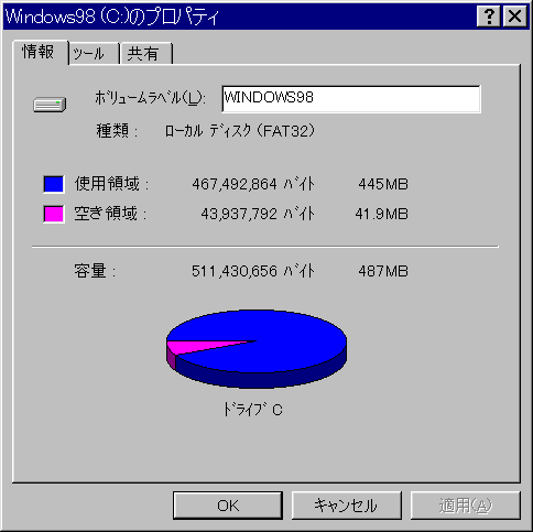 とオプション付きでFDISKを起動し、FAT32で初期化できるようにする。ちなみに489MBをFDISKで確保する場合、FAT16なら1クラスタ8KB、FAT32なら1クラスタ4KBとなる。infファイルなど小さなファイルもあるのでクラスタサイズには気を配らねばならない。