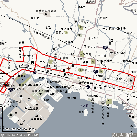 移動手段はバイク、平均速度 35km/hで流しながら、下記地図の赤い線に沿って調査した。それなりにオフィスやマンションのある路線である。