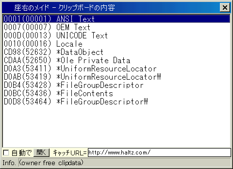 ステータスバーに表示されるのは、現在のクリップデータの所有者です。所有者の名前を取得できれば表示し、取得できなければウインドウの class 情報を、それも取得できなければウインドウハンドルを表示します。何のクリップデータかを判断するヒントになります。