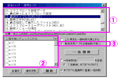 透明コーソクが、対象リストに削除可能と思われる情報をピックアップするとき、ピックアップ時のチェック状態の有無を決めるのが(3)です。(3)のチェックを入れておくと、新たに対象リストに項目を追加する場合があったときにその項目を標準でチェックした状態にして削除しないようにします。
