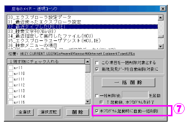 (7)のチェックを入れておくと、座右のメイド起動時に無条件に1回だけ自動で一括削除を実行します。